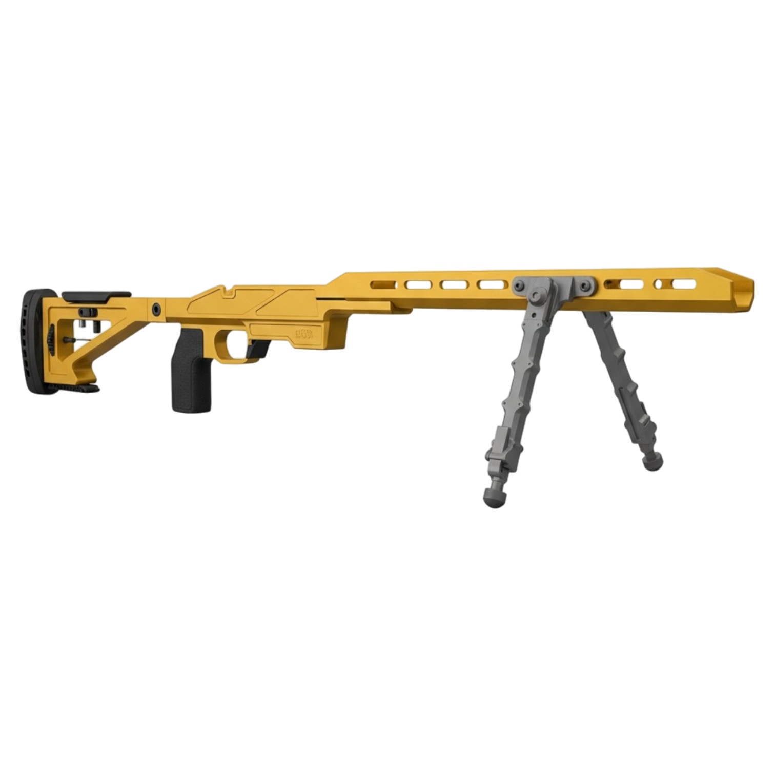 Um chassi é uma coronha construída em alumínio usinado, garantindo precisão dimensional e rigidez estrutural superiores às coronhas de madeira ou polímero. Por esse motivo, normalmente não é necessário realizar bedding ao instalar um chassi bem usinado — o acoplamento já garante alinhamento e repetibilidade de tiro ideais para precisão.